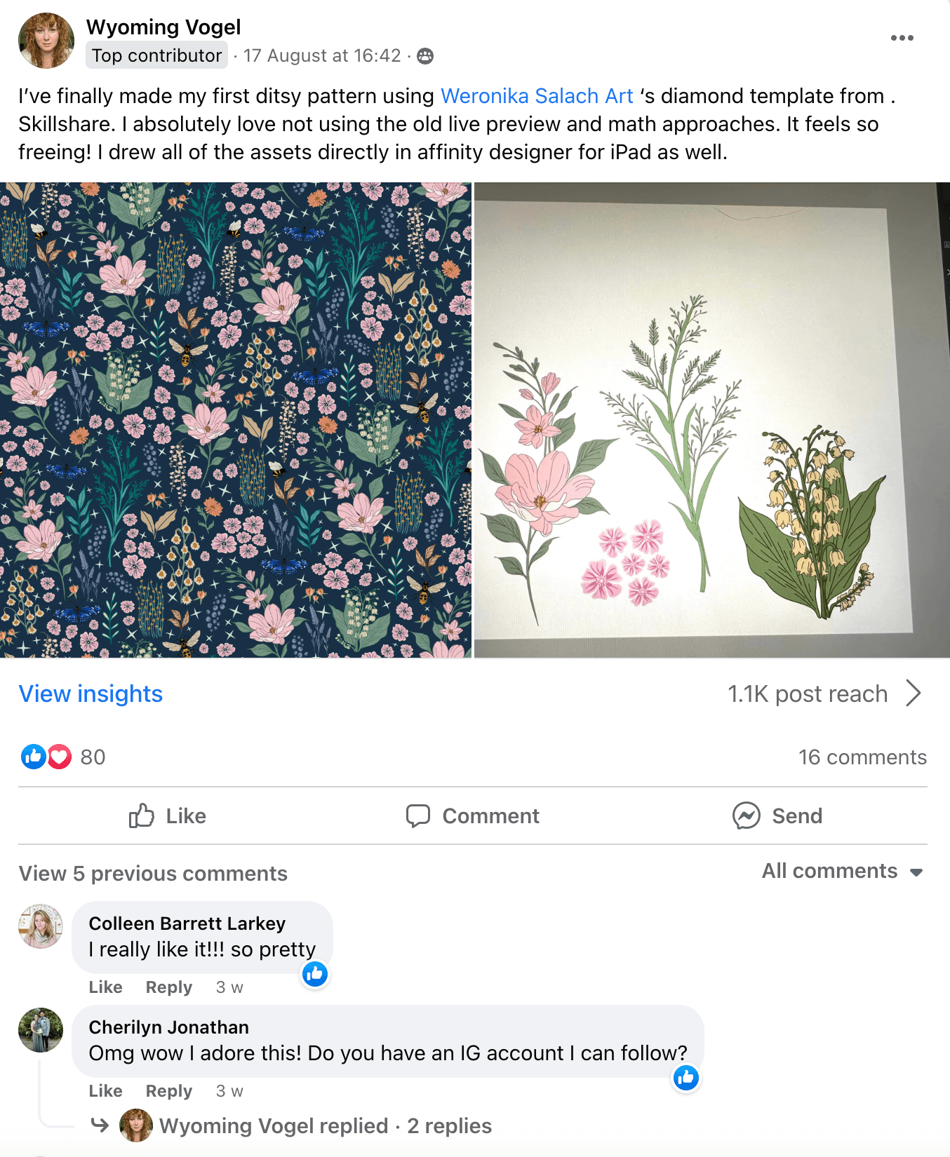 Networking within online art communities is an art in itself. Start by being genuinely interested in other artists' work. Compliment them, ask questions, and show appreciation for their creative endeavors. Networking is about building authentic connections. I’ve noticed some of my Skillshare students also moved into my FB group and this new form of communication helps me to get to know them a little bit better, which for me as a teacher is super nice. Plus, my students can get to know each other too, so I hope that the group creates not only a better teacher-student relationship, but also a student-student relationship.