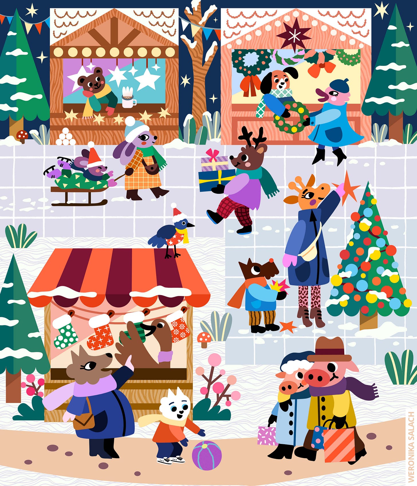 I utilize my pre-saved vector assets and recycle some elements that I’d be drawing over and over again (trees, eyes, mugs hi hi).